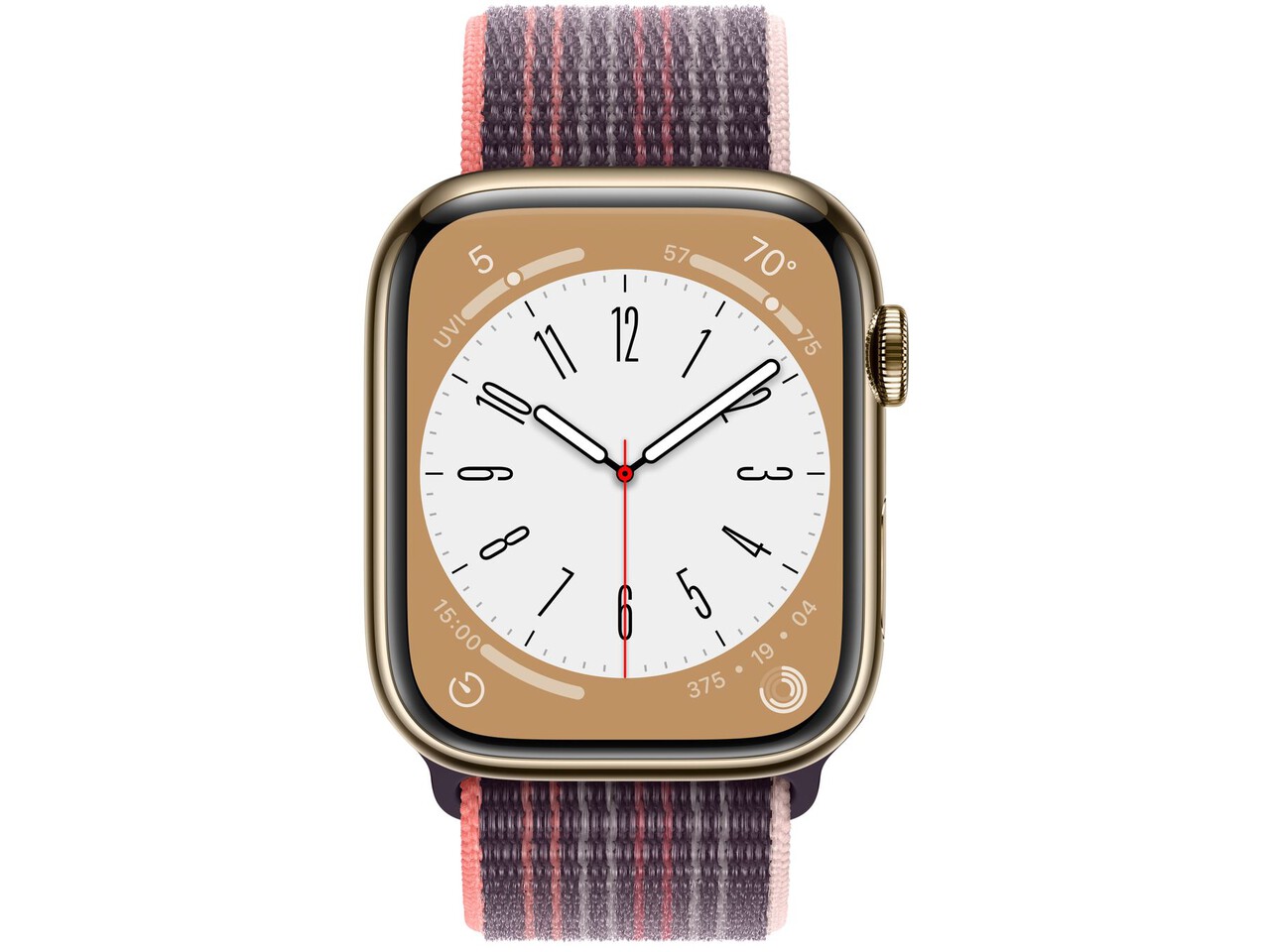 Cellular • 2022 release, 45mm Gold Milanese loop, Elderberry Sport Loop (Standard size)